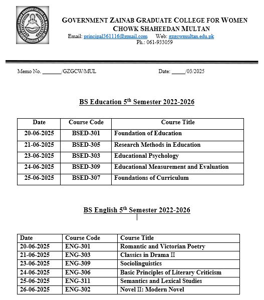 Pre-Board Exams Date Sheet 2025: Check the dates and prepare well. BS 4th Semester(2023-2027) BS 5th Semester (2022-2026)